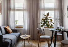 Текстильное оформление интерьера может быть не только декоративным, но и выполнять практическую функцию. Так получилось в этой студии. Здесь решили отделить спальню как раз при помощи штор, разместив кровать в нише. Для этого в потолке сделали скрытый карниз. Ткань подобрали нейтрального серо-бежевого оттенка в тон спокойному интерьеру. Шторы плотные, но не слишком тяжелые, чтобы не загромождать комнату. В открытом виде работают как часть декора, а в занавешенном состоянии создают укромный спальный уголок.
