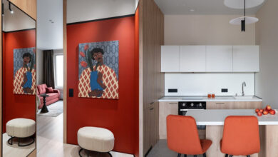 Стеновые панели отлично подходят для визуального разделения зон. Но их не обязательно покупать в готовом виде: например, если нужно минимизировать затраты. Посмотрите, как стильно их имитировали в этом примере. Рейки монтировали на стену за изголовьем кровати и выкрасили весь участок в яркий терракотовый оттенок. Получилась четко выделенная спальная зона, а весь интерьер наполнился насыщенным теплым цветом.