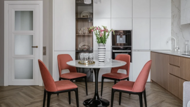 Одни из самых стильных сочетаний в интерьере получаются при объединении «соседей» по цветовому кругу. Одно из таких глубокий изумрудный вместе с бледно-голубым, которое в этой квартире реализовали на кухне. Холодную гамму поддерживают черные и белые детали, а светлый беж создает необходимый баланс. Причем элементы белого цвета здесь выглядят даже ярче, чем цветная кухня, что делает комбинацию еще более эффектной и запоминающейся.
