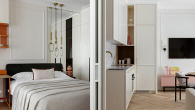 Еще один оттенок розового легкий, ненавязчивый, при этом менее привычный, чем классика в виде кремового или белого. В разном окружении он может смотреться более теплым или, наоборот, холодным. В первом случае сочетайте его с матовыми деревянными поверхностями, во втором с мрамором и другими глянцевыми фактурами. В качестве акцентных цветов отлично подойдут синий или изумрудный.