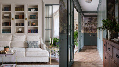 - Придерживайтесь простых форм. От витиеватой мебели с гнутыми ножками и фигурными спинками лучше отказаться, как и от массивных шкафов с фрезеровкой и декором на фасадах. Выбирайте лаконичные предметы, в том числе встроенные системы. А добавить интерьеру изюминки или сделать его более парадным поможет декор.