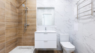 - Дополнительно подсветите зеркала, чтобы в них было удобно смотреться. Лампы в этой зоне должны быть достаточно яркими, без перекоса в слишком теплый или слишком холодный свет.
