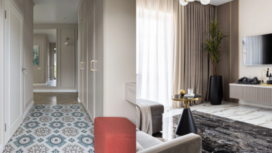 Эта квартира предназначена для сдачи в аренду, однако хозяйка и дизайнер подошли к интерьеру творчески. Хозяйка хотела интерьер «не как у всех», и Анастасия Заркуа выполнила это пожелание. До ремонта здесь был ремонт, выполненный в 2000-х. В частности, в ванной комнате светлая плитка с мелкими декоративными вкраплениями. Пространство преобразили полностью. Вместо ванны сделали душевую с поддоном. Пол оформили плиткой с рисунком, создающим оптическую иллюзию. На стенах бежевая мелкоформатная плитка и краска. Над душевой «окошко» из стеклоблоков, благодаря чему днем в ванной комнате достаточно светло.