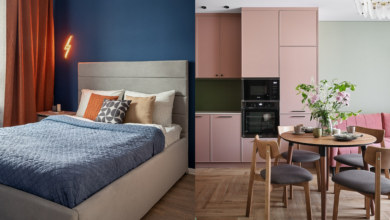 Дизайнер взяла за основу стиль ваби-саби, который нравился хозяйке квартиры. Поэтому в отделке стен использовали рельефную декоративную штукатурку в природных тонах, по фактуре напоминающую замшу. Даже в мокрых зонах, таких как ванная или кухонный фартук, отказались от настенной плитки использовали микроцемент. В ванной отказались еще и от стандартного полотенцесушителя вместо этого сделали «теплую» стену и выбрали декоративную деревянную лесенку, на которой можно сушить полотенца.