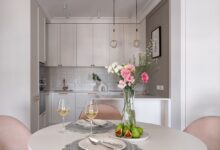 Квартира по проекту Татьяны Кулинченко и Виктории Домоцевой принадлежит женщине. Дизайн заказывала ее взрослая дочь. Татьяна и Виктория выполнили проект в стиле неоклассика с элементами прованса. В частности, в гостиной это прослеживается в выборе мебели диван с чехлом, украшенным пуговицами, намекает на прованс; тумба под телевизор на ножках с филенками на классику. В отделке тоже можно отметить классические черты: «елочка» из плитки на полу, высокие карнизы, молдинги. Молдинги размещены рамкой на стене с телевизором. И выкрашены в приятный зеленый оттенок. Эта стена стала ненавязчивым акцентом.
