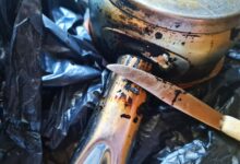 - В ненужный носок вставьте небольшую пластиковую емкость (например, баночку от сметаны или обрезанную бутылку из-под напитка), засыпьте в нее тяжелый наполнитель (крупу, горох, песок).