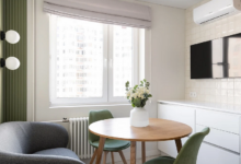 В условиях ограниченной площади основные зоны могут быть сосредоточены в одной комнате. В этом случае, если кровать размещена в углу, ее можно выделить при помощи акцентной стены. Так вы получите уютное спальное место, при этом визуально оно будет четко отграничено от рабочего места, столовой зоны, кухни. При наличии второго яруса наверху можно обустроить спокойное ахроматическое пространство, а нижнюю часть комнаты оформить в более насыщенных тонах.